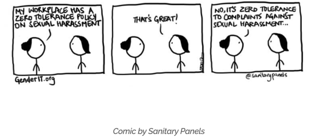 A work environment that is riddled with sexual harassment, where employees take this to be a fact and turn a blind eye to misconduct for fear of retaliation, is bound to have low psychological safety. Psychological safety is the belief that you will not be punished or humiliated for speaking up with ideas, questions, concerns, or mistakes.