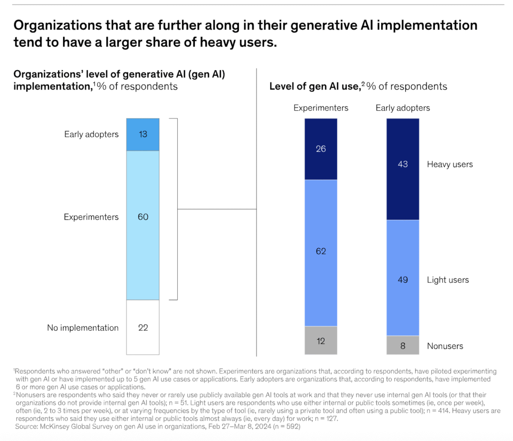 Even as employees report high levels of AI use, companies do not seem to be keeping up. In fact, they seem to be lagging behind by miles. McKinsey’s research shows that only 13% of employees surveyed have confirmed that their companies have built organisational maturity in AI use. Most companies that have yet to build capacity for productive and responsible use of AI, have a higher percentage of employees who heavily use gen AI tools.