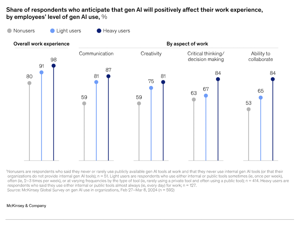 AI adoption is exploding across workplaces globally. 91% of employees in a recent study said that they use gen AI for work. Most of them, whether light users or heavy users, said that AI impacts their work positively and enhances their abilities, from creativity or critical thinking.