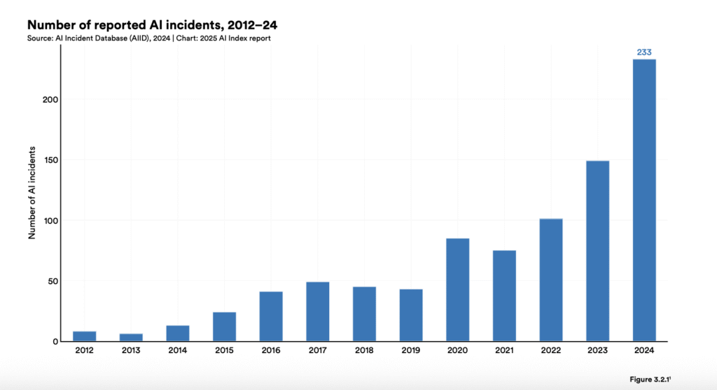 These risks are now out of filing documents and have begun affecting real lives of people and reputations of companies. Reports of incidents of AI misfiring resulting in ethical, legal and operational lapses have shot up. Between 2023 and 2024 the increase was as high as 56.4%.