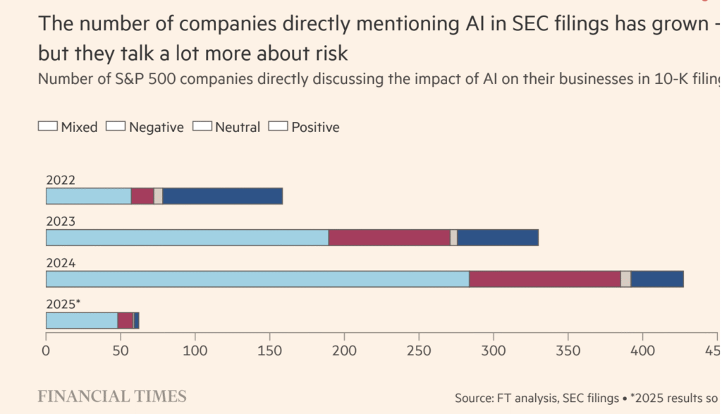 But the problems that companies are staring at without a solid AI strategy go beyond productivity loss. In SEC filings companies are predominantly reporting risks of AI use rather than its benefits, in terms of cybersecurity, legal breaches and so on.